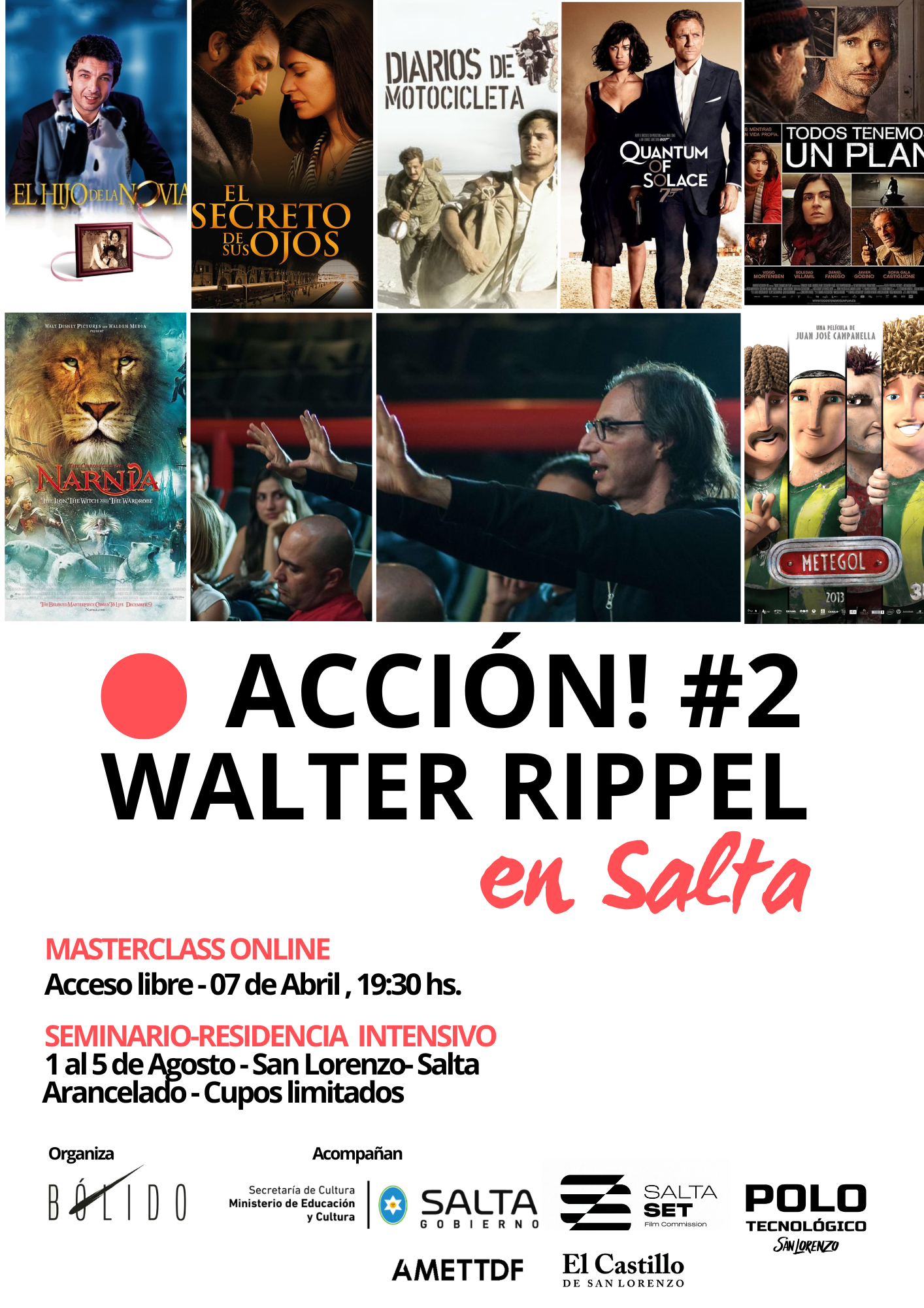 La Secretaría de Cultura de Salta, a través de la Dirección de Audiovisuales y la film commission Salta Set, junto a Bólido Studio de Ushuaia, organizan un seminario – residencia dirigido a actores, directores y guionistas, a cargo del reconocido Walter Rippel.